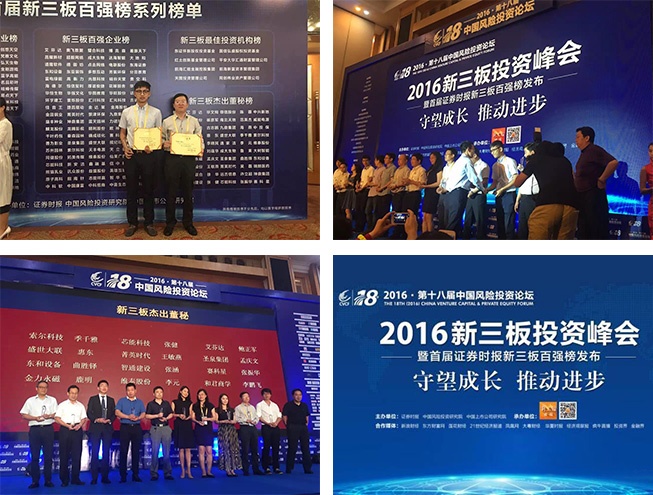 6月8日,由证券时报和中国风险投资研究院共同举办的“2016新三板投资峰会”在深圳五洲宾馆隆重举行,芯能科技在此次峰会上获得首届新三板百强企业,董秘张健先生获得首届杰出董秘称号。