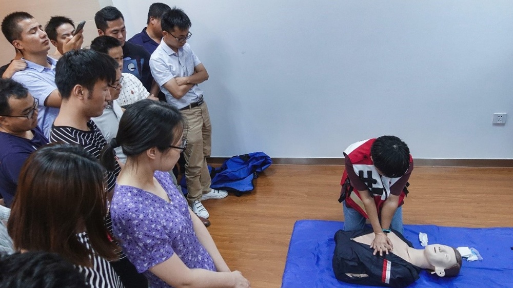 培训分急救知识和实践操作两个部分。沈亮老师利用人体模型、多媒体教案、现场演示、实际案例等多种方式,讲授了救护基本概念、心肺复苏要领以及创伤救护需要注意的事项等现场救护知识,并向学员们演示了心肺复苏术、人工呼吸法等紧急救护技术,部分受训人员还进行了现场模拟操练。