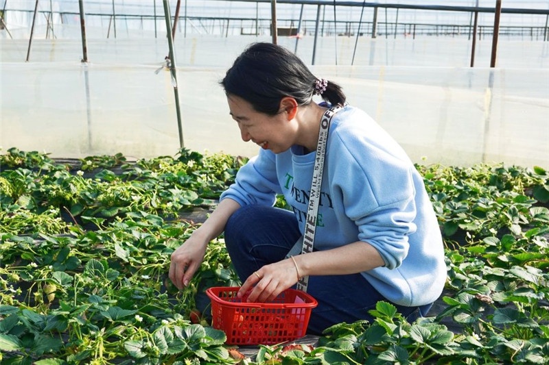 在采摘园内,女职工们踏着春天的泥土快步健走,零距离感受大自然风光。草莓棚中,一畦畦碧绿的草莓秧下,一颗颗鲜艳欲滴的草莓散落在绿叶丛中,芬芳的果香扑鼻而来。虽然大棚里道路狭窄、空气较为闷热,但是每个人的热情却丝毫未减,大家边采摘边交流,现场气氛轻松活跃,欢声笑语不断。