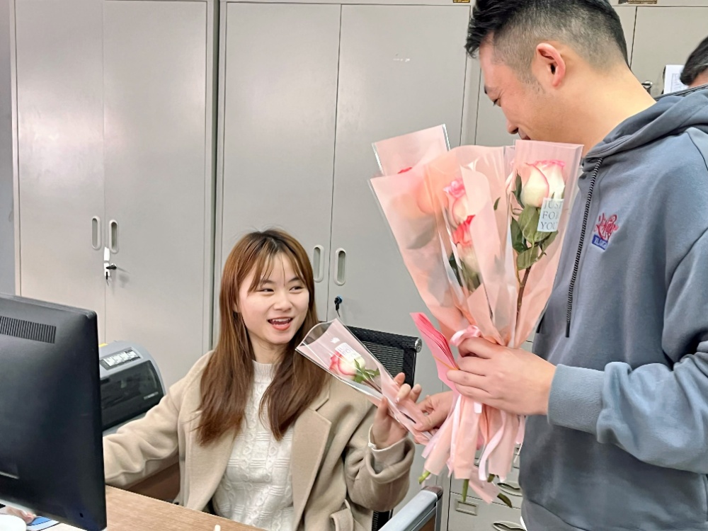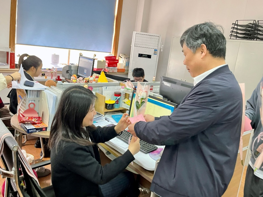一大早,工会主席金治明及工会委员便深入各部门,向在岗的每一位女职工送去鲜花、礼品和节日问候,以此传递美满、健康、快乐的美好寓意。一朵朵美丽芬芳的鲜花,一句句温馨真诚的祝福,使女职工们切身感受到了大家庭的温暖和关爱。
